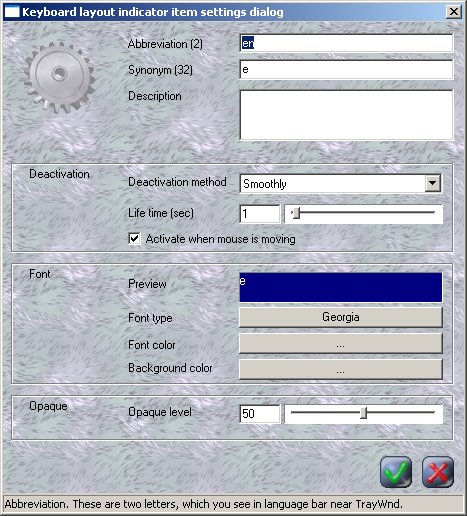 en Each Keyboard item present own language. You can set for different language different settings: font, color, background color, opaque and behavior.