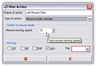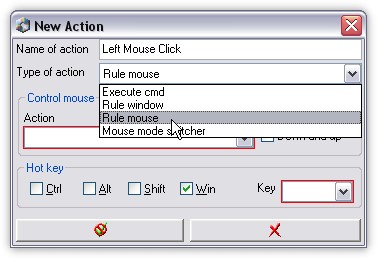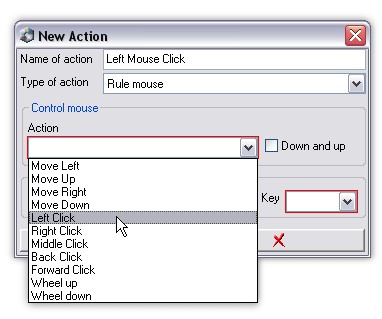 ... and then you can choose type of action (Left Click). Down and Up checkbox means, that one keystroke Press and Release mouse button.